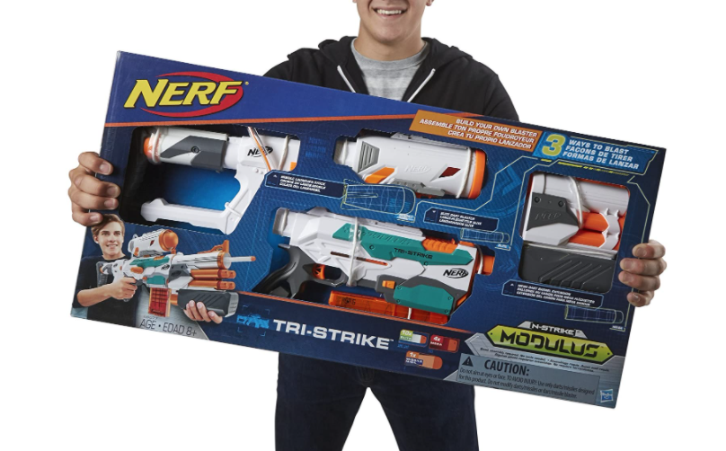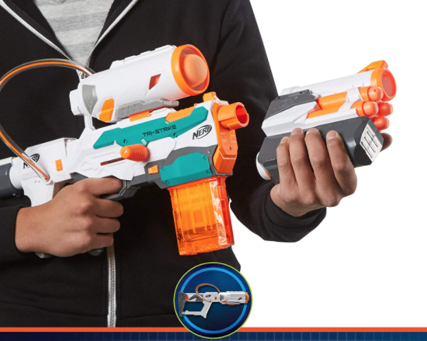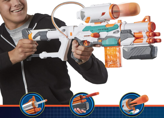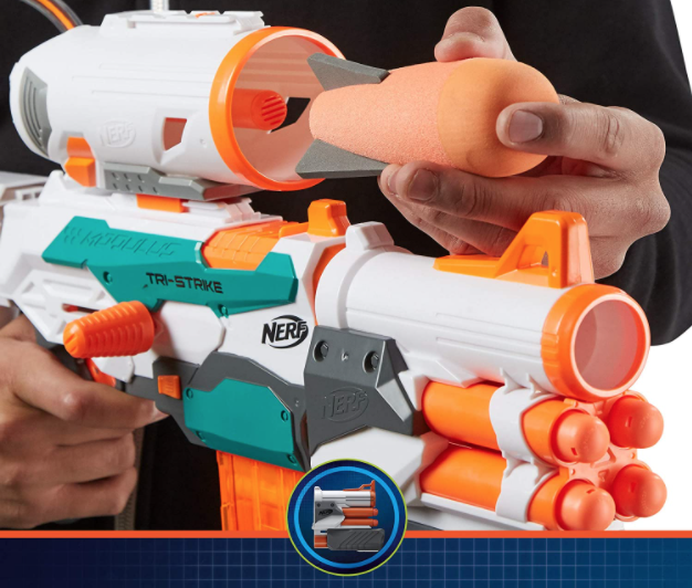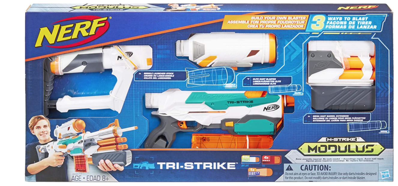 ¡Los niños pueden construir su propio blaster para cada misión con el blaster Nerf Modulus Tri-Strike de Hasbro! El desintegrador Tri-Strike presenta 3 formas diferentes de disparar que se pueden usar por separado o combinadas para configuraciones personalizadas. ¡Lleva un arsenal completo al campo de batalla con la versatilidad y el poder del bláster Tri-Strike! Comience a construir con el Elite Dart Blaster y el combo de clip de 10 dardos acoplable. ¡Dispara dardos Elite con precisión o dispara 10 seguidos usando una acción de perno deslizante rápido! Extienda el cañón con la extensión Mega Barrel. Luego dispara Mega dardos con el alcance aumentado de este gran barril. ¡Conecte el lanzador de misiles y el lanzador de misiles al Elite Dart Blaster para obtener un blaster aún más grande! Luego, separe el lanzador de misiles y el lanzador de misiles, para unirlos y obtener un blaster de misiles de respaldo sigiloso. Expanda las opciones de personalización con los kits de actualización Nerf Modulus (cada uno se vende por separado). ¡Con el sistema Nerf Modulus completo, son posibles más de 1000 combinaciones diferentes! Nerf y todas las propiedades relacionadas son marcas comerciales de Hasbro.